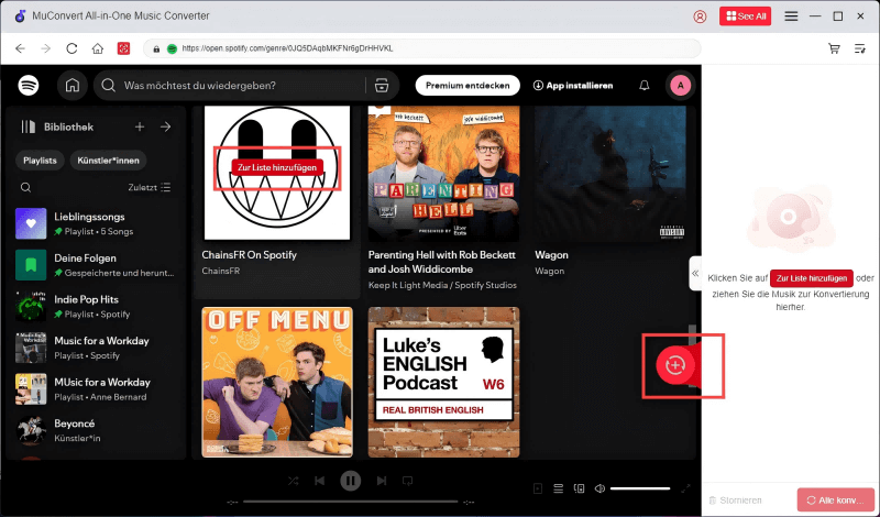 Schritt 3. Suchen Sie nach dem Spotify Podcast, den Sie speichern möchten. Ziehen Sie ihn direkt auf das Plus-Zeichen hinzu oder klicken Sie auf den Button „Zur Liste hinzufügen“.
