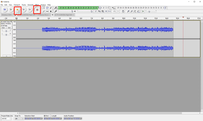 Schritt 3. Spielen Sie den gewünschten Song auf einer Streaming-Plattform wie Spotify ab. Klicken Sie in Audacity auf den roten Aufnahme-Button, um die Streaming-Audioaufnahme zu starten. Beenden Sie die Aufnahme mit dem quadratischen Stop-Button.